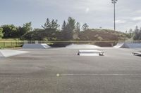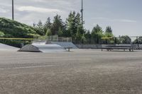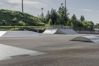 A low angle view of a concrete skatepark in Toronto, Ontario, Canada. The park features various ramps and obstacles for skateboarders and skaters to enjoy on a sunny day.