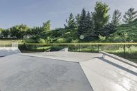 A sunny day at the skatepark in Toronto, Ontario, Canada, with clear skies and low contrails in the background