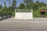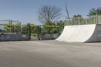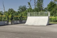 A low angle view of a skateboard park in Toronto, Ontario, Canada. The concrete surface and asphalt road create the perfect space for recreational activities. The clear sky and lush vegetation surrounding the park add to the scenic landscape.
