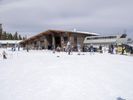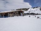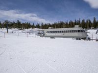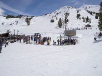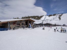 Skiers take to the Mammoth Lake ski slope in the California mountains during winter. The open space is full of snow, glacial ice, and mountain landforms, with the alps in the background, and sunshine on the surface.