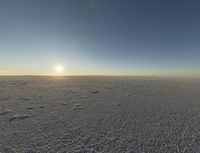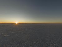 The azure afterglow of the night sky reflects off the frozen salt surface of Bonneville Speedway in Salt Lake City, USA. The two-lane track winds through the dry desert of Utah, surrounded by the mountain range and snow-covered wilderness of the American highlands.