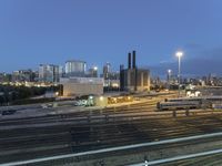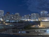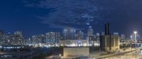 Aerial view of the metropolitan area of Chicago, Illinois, USA, with its high-rise buildings, skyscrapers, concrete surfaces, parking garages, and open spaces illuminated by artificial light during the night, surrounded by the dark sky dotted with clouds.