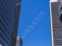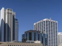 A view of the iconic skyline of Los Angeles, California, USA. Home to an aerospace manufacturer, the city is known for its air travel and automotive design, with the buildings of its business district outlined against a clear, azure sky. Automobiles, planes, and other land vehicles dot the concrete thoroughfares and parking lots, while trees and other fixtures add texture to the urban design.