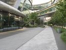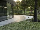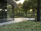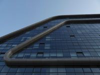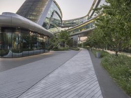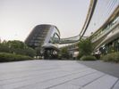 A cityscape of Shanghai and its many skyscrapers with a reflection in the glass of a modern office building in the Soho district. A clear sky reveals the city's futuristic architecture and bustling metropolitan area at dawn.