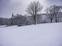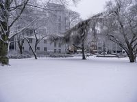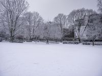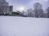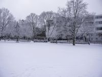 The sun casts its light on the frozen landscape of a residential area, with woody plants and buildings creating a natural atmosphere in this snowy world.