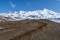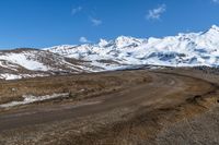 A stunning view of a snowy landscape in New Zealand, with snow-covered mountains, clouds, and a dirt road leading through the scene.