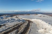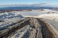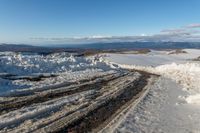 A breathtaking overview of a snowy mountain landscape in New Zealand on a clear day, with a road straight down the road leading to an overlook.