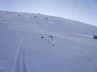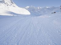 A ski piste in the French Alps provides a scenic recreation area for tourists. The terrain is covered in snow and ice caps, with a glacial mountain landform in the background. The clear sky and open space offers an excellent view of the natural environment of the massif and the valley below.