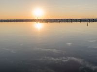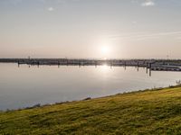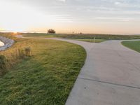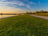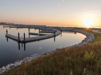 The spectacular dawn sky reflects upon the coastal waters of Milwaukee, Wisconsin, USA, as the sun rises over the recreational pier, jetty, and grassy shore. The clear sky is filled with sunshine, and the calm ocean provides a peaceful natural environment. The concrete road and surrounding grass surfaces provide a path for travelers to enjoy the beauty of the sea and its resources.