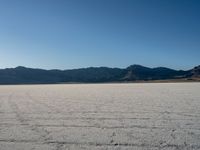 an open salt desert with sparse snow on it and mountains in the distance under blue sky