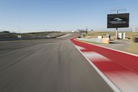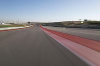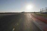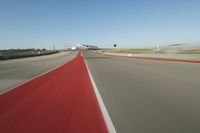 A highway curves in the distance, leading to a race track with a grandstand and an airplane taking off in the background. The clear sky and sunshine create a beautiful landscape of transport infrastructure.