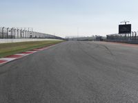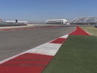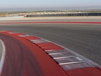 The red automobile races down the highway, the asphalt road curving slightly in front of a clear sky. As the sun rises, the horizon stretches out with a field of clouds and fixed structure of the mode of transport, the grandstands and the airplane runway to the left. The race track leads straight down the road, inviting for a fast-paced race.