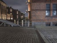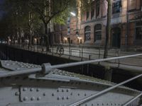 The Speicherstadt of Hamburg, Germany is a metropolitan area with a unique blend of classic architecture, artificial light and modern infrastructure. At night, the urban landscape is illuminated by street lights, office buildings, bridges and trees, while cobblestone roads, handrails, guard rails, and stairways create a timeless atmosphere. The coastal city is a business and art district, full of public spaces, curbs and alley-ways, with brickwork and iron reflecting a classic German style.