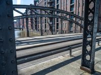 a train crossing over a bridge on a railway track with a building behind it in the background