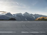 Dawn breaks over a parking lot in Austria, revealing a stunning view of the European landscape. Clear skies overlook the open space and mountain profile, offering a pleasant natural packshot of the break of day.