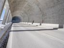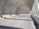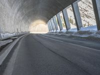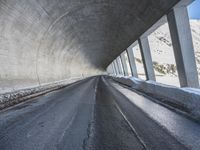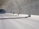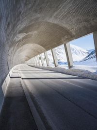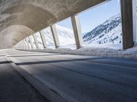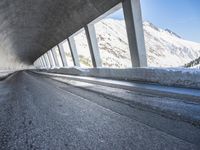 The dawn of a new day in Europe reveals a stunning view of the alps, with a concrete bridge and motor vehicle spanning a snow-capped mountain range, surrounded by a glacial horizon of low-lying trees and frozen water.