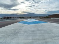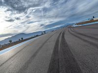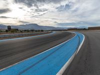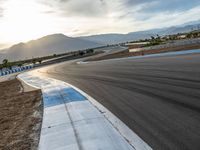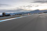 The sun is visible above the race track at the break of day, as a race car drives straight down the road on the asphalt curve.