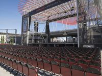 A modern steel building facade with a sloping roof, located at a race track, stadium, arena, auditorium or performing arts center, providing a stage for racing and other performing arts.