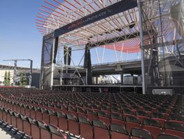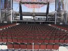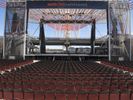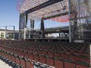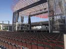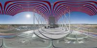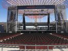 A large steel building with a sloping roof stands in the foreground, surrounded by a race track in the background. The structure is part of a large race arena, stadium, performing arts center, field house, or theater.