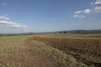 A scenic view of a straight road leading through the vast African savanna, surrounded by sand, dirt, grass surface, and a clear sky.
