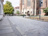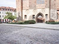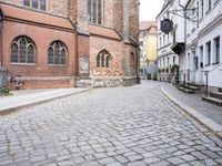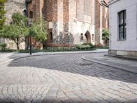 A view of a classic architecture and cobble stone road in Berlin, Germany. Tourists can see the beautiful historic site, vegetation, public space, and infrastructure of the city, such as the stone wall, walkway, building facades, lane, asphalt, estate, courtyard, town square, driveway, plaza, and window arch. The residential area offers a view of the urban property with woody plants, brick, and flooring along the curbs.