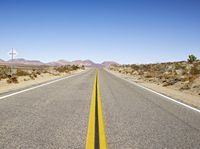 A scenic view of a straight road in California, USA, with asphalt stretching into the desert landscape. The yellow lines on the road surface create a perfect horizon as the clear sky blends with the natural environment. This road trip captures the beauty of the infrastructure and the expansive nature surrounding it.