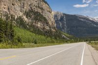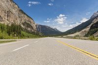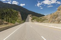A low-angle view of an asphalt road stretching through the highlands of Canada, lined with trees and guard rails, under a cloudy sky. The road surface and vegetation create a picturesque scene in British Columbia, Alberta.