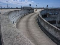 A view of a straight road surface in the city, lined with asphalt and shaded by street lights. The open space and clouds in the sky add to the urban scenery.