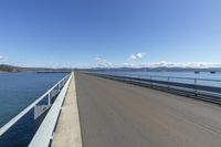 A straight road leads to a stunning coastal landscape, with azure waters and a clear horizon.
