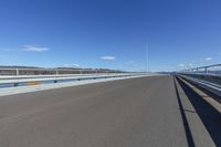 A scenic view of a straight road surface leading towards the horizon, with a line of street lights and an Armco barrier. The road runs parallel to a beautiful azure lake, with a bridge crossing over it. The landscape is surrounded by a coastal area, with a fence and guard rails along the road. The sky is filled with fluffy white clouds, adding to the serene atmosphere.