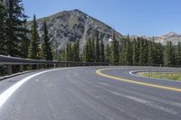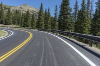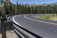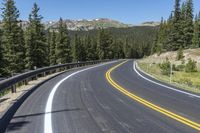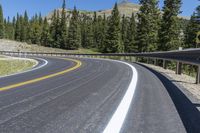 A scenic landscape view of a straight road in Colorado, USA, surrounded by low mountains and lush forests on a clear day with a blue sky. The asphalt road is lined with Armco barriers, leading towards the picturesque town of Crested Butte through Cottonwood Pass.