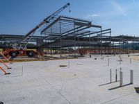 A view of a straight road cutting through a bustling cityscape, with towering skyscrapers and construction sites, under a clear blue sky.