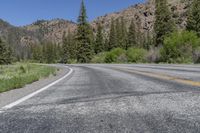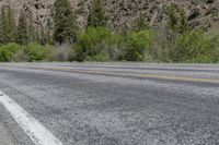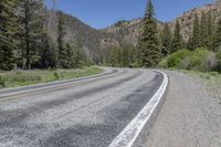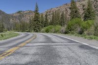Scenic landscape of Crested Butte, Colorado, USA. A straight road leads through the picturesque forest and grassy hills, surrounded by majestic mountains and woody plants. The asphalt road surface stretches parallel to the low and highland vegetation, creating a beautiful line in the natural scenery. Enjoy the clear sky and the touch of grey from the larch trees along the way.