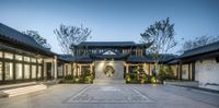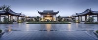 A beautiful dawn in Chongqing, China, with a straight road leading to a residential area. The clear sky and artificial lights create a mesmerizing scene.