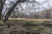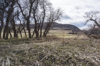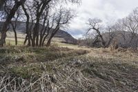 A scenic view of a dirt road surrounded by mountains, grass, and trees in Denver, Colorado, USA.