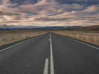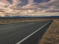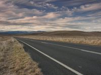 A scenic view of a straight road cutting through the highland landscape with asphalt surface, surrounded by lush vegetation, trees, and grassy plains under a cloudy sky. The sunlight filters through the trees, creating a beautiful afterglow over the mountains on the horizon.