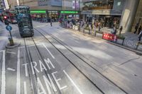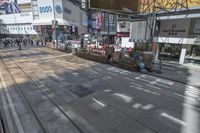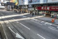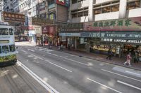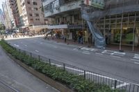 A view of a straight road in the bustling city of Hong Kong, China. The asphalt road surface is lined with high-rise buildings, shops, and storefronts. Pedestrians can be seen walking along the sidewalk, with a busy crosswalk in the foreground. The elevated tram track adds to the urban design of this vibrant Asian metropolis.