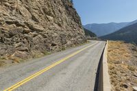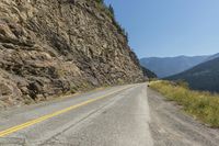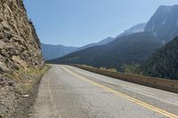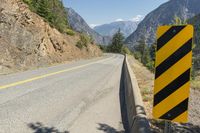 Aerial view of an asphalt road winding through the low landscape of Lillooet, British Columbia, with majestic mountains in the background on a clear day.