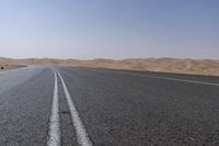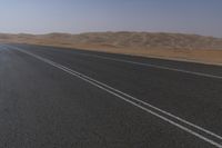 The long, straight highway of the Liwa Desert runs along the horizon, a stark yet dramatic contrast between the flat desert plain and the rugged, panoramic view of the rugged mountain badlands in the United Arab Emirates. Despite the low infrastructure, this is an ideal mode of transport for a clear day in the desert.