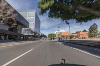 A view of the asphalt road in Los Angeles, California, USA, with the cityscape and high-rise buildings in the background. The motion blur of passing vehicles adds a sense of speed and urban energy to the scene.