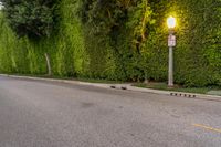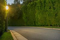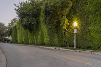 A scenic view of a straight road lined with hedges, trees, and green vegetation in Los Angeles, California, USA.