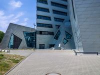 A view of a modern city with futuristic architecture and straight roads leading into the urban landscape.