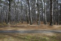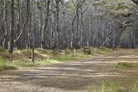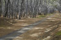 A scenic road in New Zealand's wilderness, surrounded by lush forests and grassy landscapes, with sunlight filtering through the trees. This medium format image captures the natural beauty of the Auckland state park, showcasing the straight path leading into the grove of birch trees.