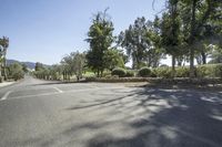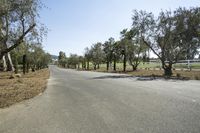 A scenic view of a neighborhood in Ojai, California with a straight road surrounded by lush green grass, trees, and residential properties.