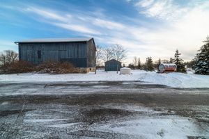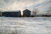 A sunny dawn in Toronto, Canada. The sun is visible, casting a warm glow on the asphalt road leading to an open space with a barn and shed. The sky is filled with fluffy clouds and a light dusting of snow can be seen on the ground.