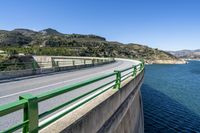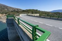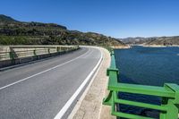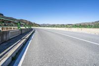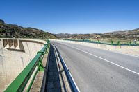 A scenic view of a straight road in Spain, with asphalt stretching out into the distance. The road is located along the low coastal area, offering beautiful views of the ocean. A bridge can be seen crossing over a river, adding to the picturesque landscape. The clear sky and natural surroundings make this photo a perfect representation of the beauty of Spain in Europe.