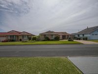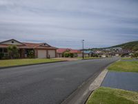A view of a straight asphalt road surrounded by residential buildings and lush vegetation in a suburban neighborhood.