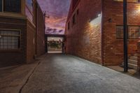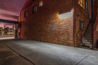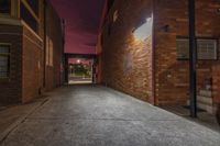 A view from a window looking down a straight road in a suburban neighborhood, with houses, brick walls, and street lights lining the way.