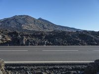A scenic view of a straight road cutting through the volcanic landscape of Tenerife, Spain. The road surface, made of asphalt and tar, leads through a low-lying valley surrounded by majestic mountains. The clear sky above highlights the brown terrain and vegetation, creating a serene and picturesque rural scene in this European island.