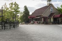 A view of a straight road in a residential area of Toronto, Ontario, Canada. The road surface is made of cobblestone, surrounded by classic architecture and lush trees. The open space and low-rise buildings create a serene and suburban atmosphere.